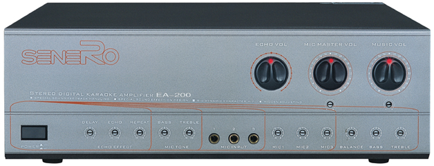 最大输出功率(1KHz,8Ω) : 135W+135W 谐波失真 (1KHz,60W,8Ω) : 0.05% 输入灵敏度/阻抗 MIC : 4.5mv/3.5kΩ CD/AUX : 300mv/20kΩ BGM : 300mv/10kΩ 输出灵敏度/阻抗 : PRE-Output 2v/1kΩ 频率响应 麦克风 : 40Hz~15KHz, +8/-3dB 音乐 : 20Hz~15KHz, +8/-3dB 音调控制 音乐 低音 : +8/-10dB (100Hz) 高音 : +8/-10dB (30KHz) 麦克风 低音 :±10dB (100Hz) 高音 : ±10dB (30KHz) 步进控制范围 : 9 Steps, ±2-1/2 tone 视频输入灵敏度/阻抗 L 1Vp-p/75Ω 视频输出灵敏度/阻抗 : 1Vp-p/75Ω 供电 : AC110V-120V Or AC220-240V / 50Hz-60Hz 电压选择 : 2 |