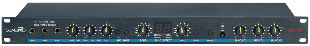 DSP-99是专为专业卡拉OK而设计,有99种数码混响效果。音乐、混响、麦克风独立音量调整内置超低音输出,分频点可调,麦克风高、中、低音可独立调整,使演唱更专业、轻松、自如。